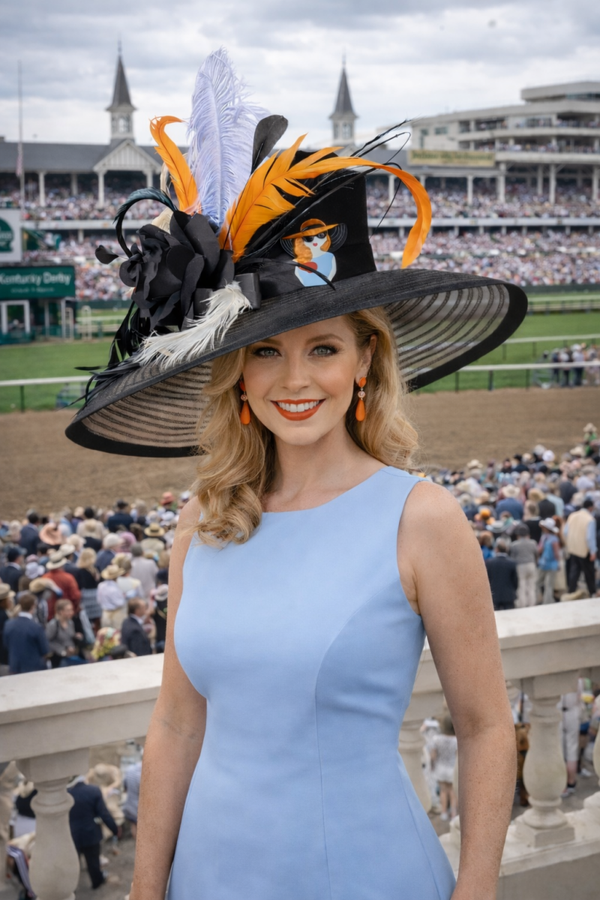 Overall, this hat feels confident, fashion-forward, and unmistakably Derby-worthy—designed for the woman who wants to stand out in photographs, command attention at the rail, and embody modern Southern glamour with a playful couture twist.