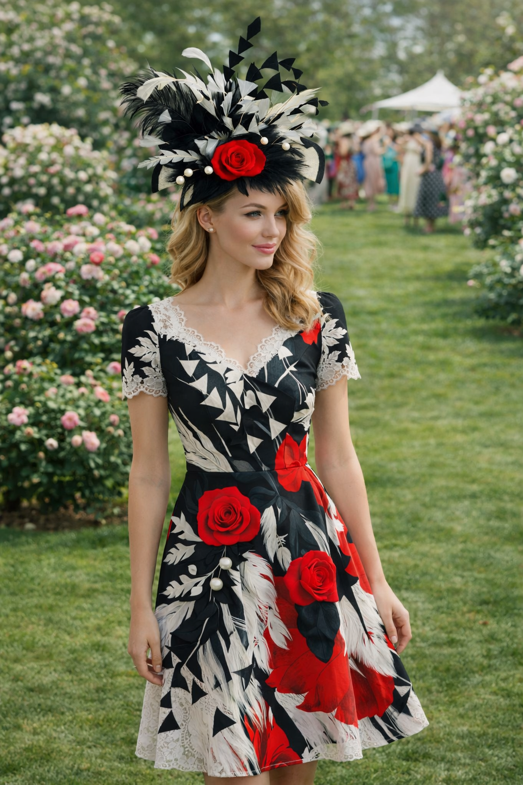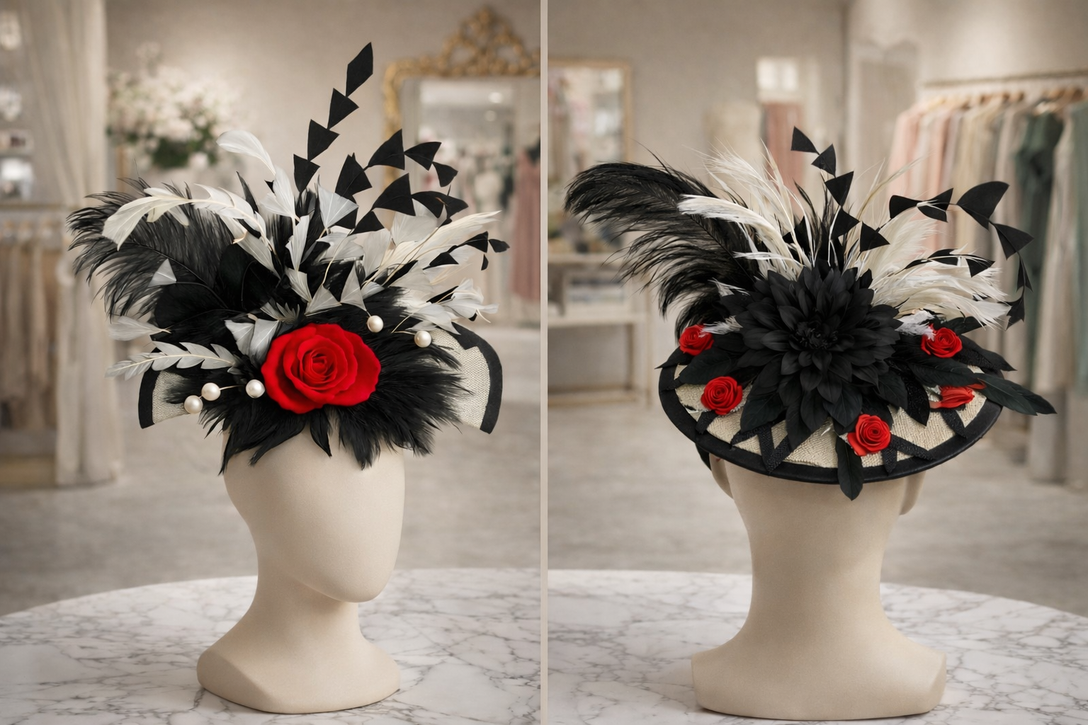 This fascinator is a dramatic, couture statement piece that blends classic Derby elegance with bold graphic artistry.