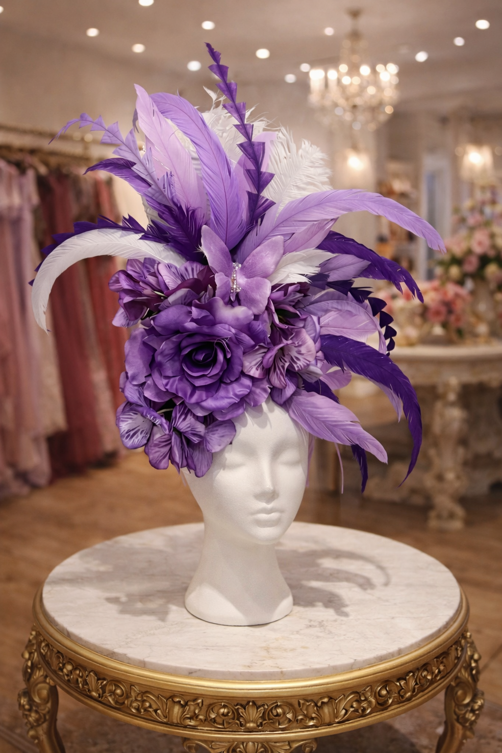Purple Reign is a show-stopping fascinator that commands attention with regal confidence and romantic drama. A lush arrangement of layered violet and lavender blooms forms the centerpiece, creating rich depth and texture, while sweeping feathers in shades of amethyst, plum, and soft white rise and cascade with elegant movement. Delicately cut feather tips and airy wisps add height and artistry, giving the piece a couture, almost sculptural presence.