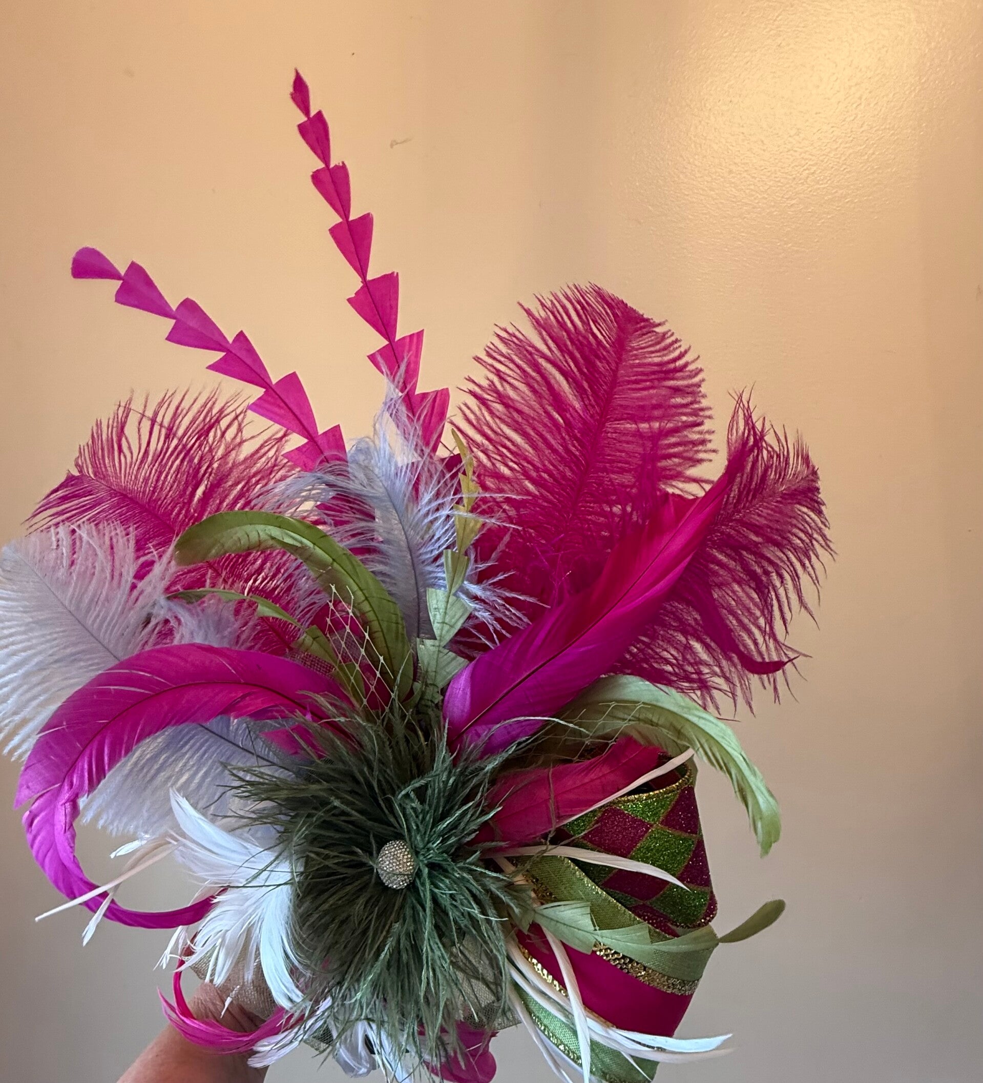 Annabel at First Turn is a striking Derby fascinator designed to command attention at the rail. A lush composition of vibrant fuchsia, soft white, and fresh green feathers creates dramatic height and movement, echoing the thrill of race day as the field rounds the first turn at Churchill Downs.