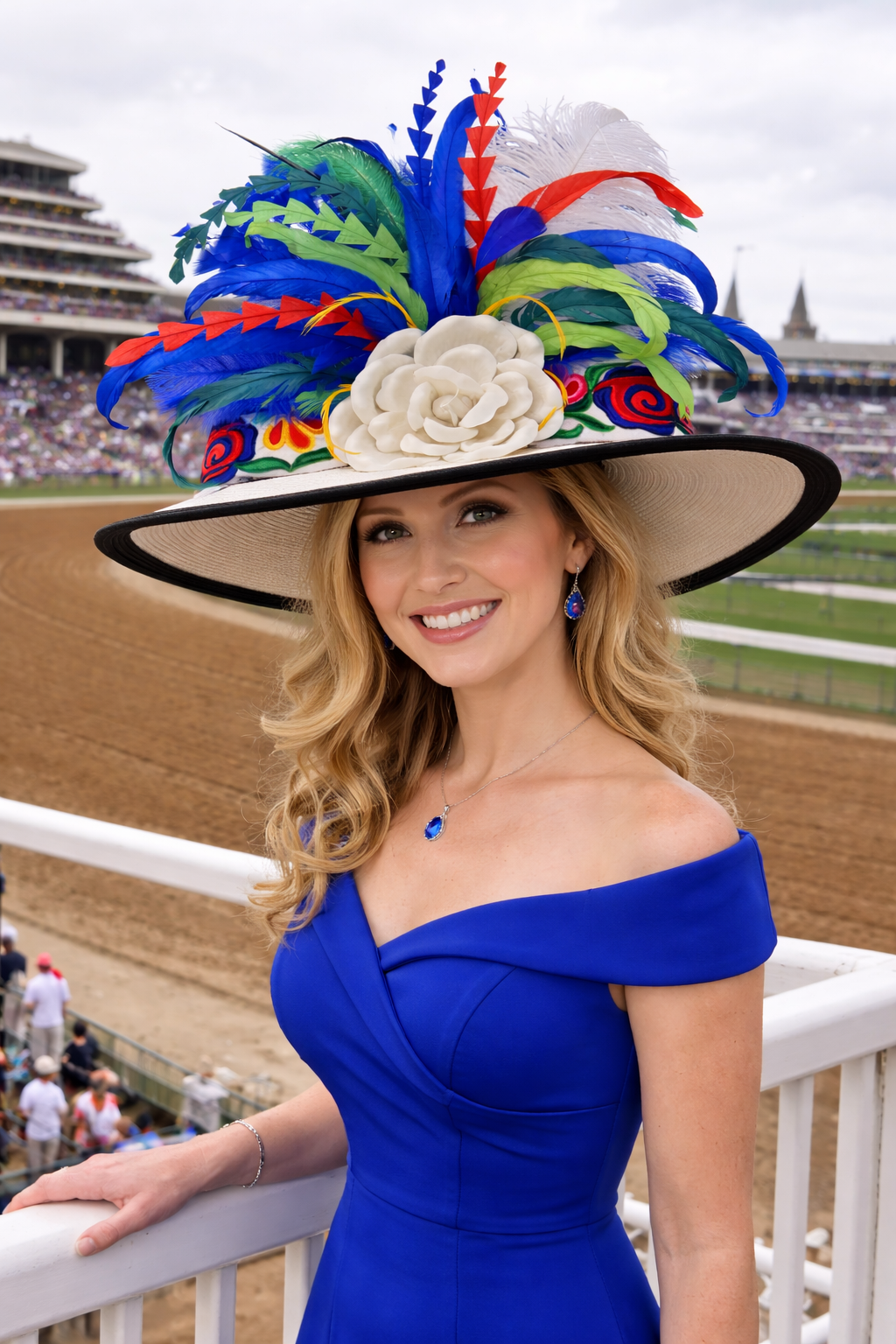 Michelle Bell is a statement of refined Derby glamour, blending classic millinery with bold, celebratory flair. Set on a striking black-and-white brim, this hat features a dramatic arrangement of cobalt blue, emerald green, crisp white, and vibrant red feathers that rise gracefully, creating movement and height worthy of the grandstand.
