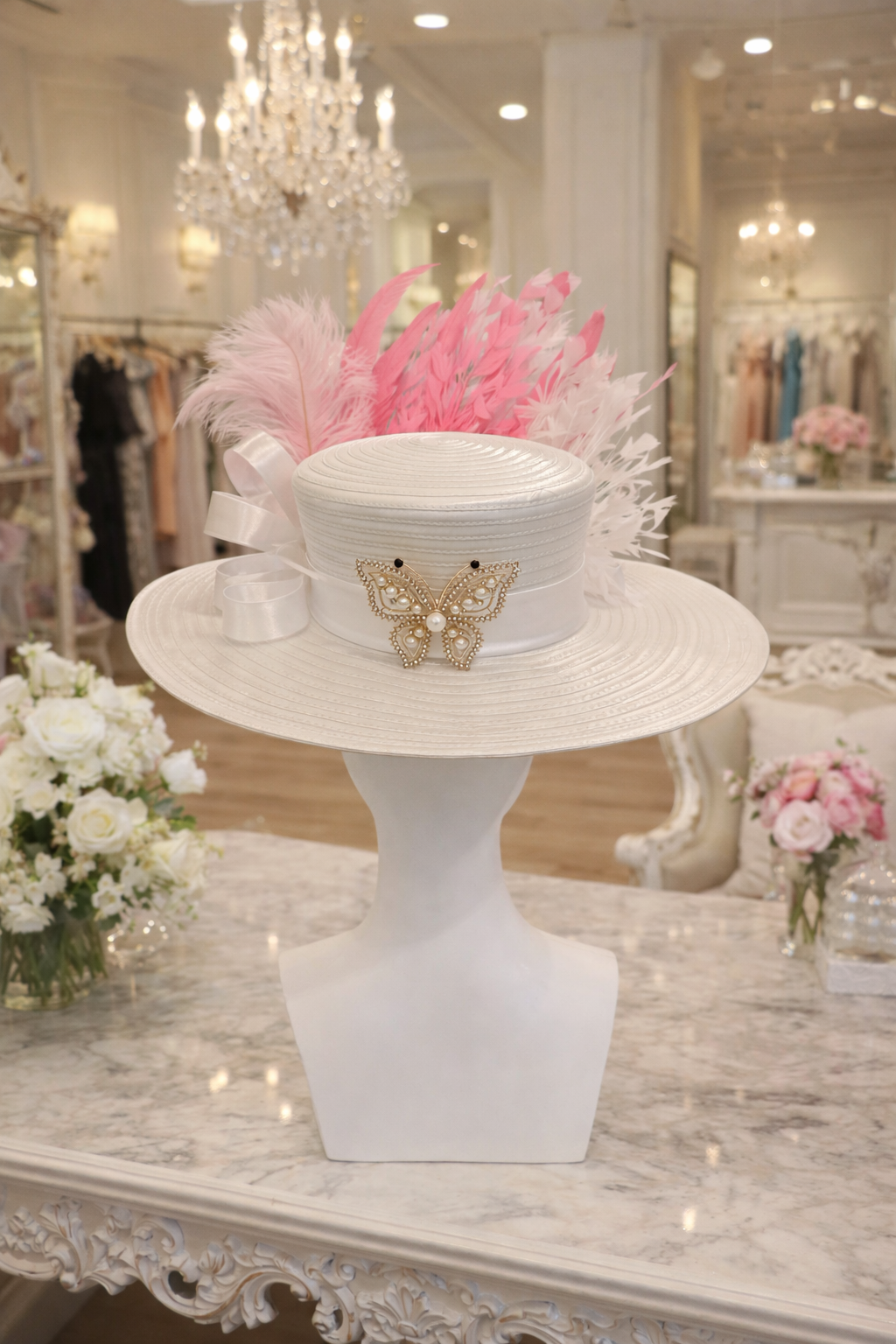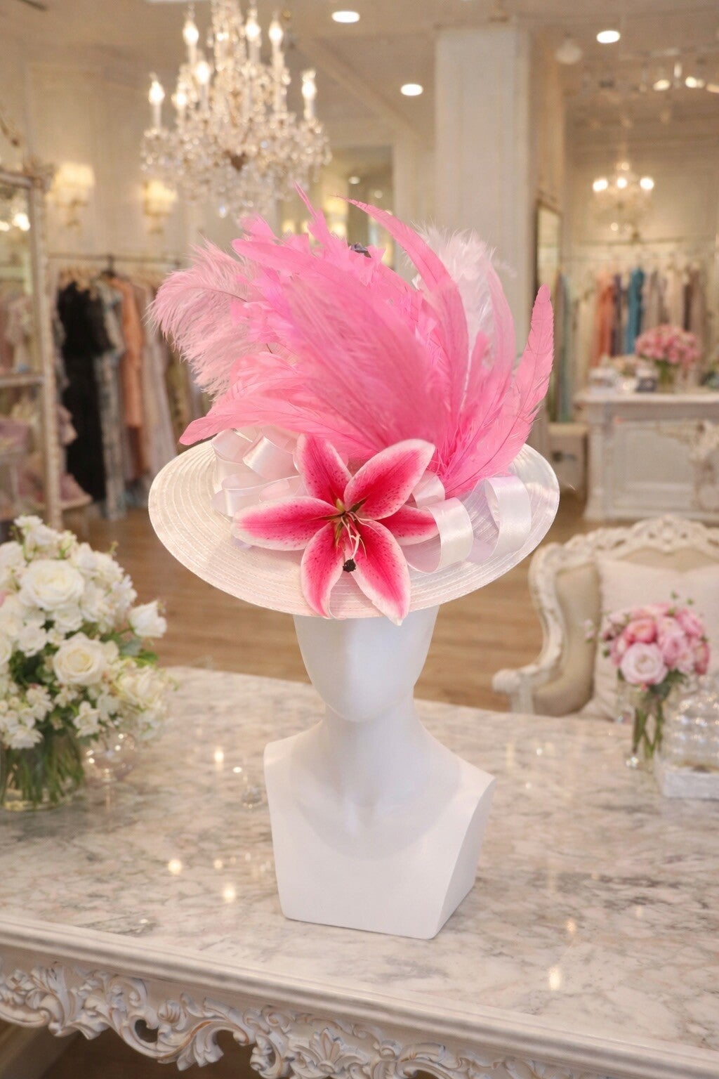 Graceful, refined, and effortlessly Southern, Lily Catherine is a celebration of Kentucky Oaks elegance. This timeless white Derby hat blooms with a striking pink lily centerpiece, symbolizing femininity, beauty, and springtime at Churchill Downs. Soft cascading feathers in delicate shades of blush and pink create graceful movement, while satin ribbon detailing adds a touch of classic sophistication.