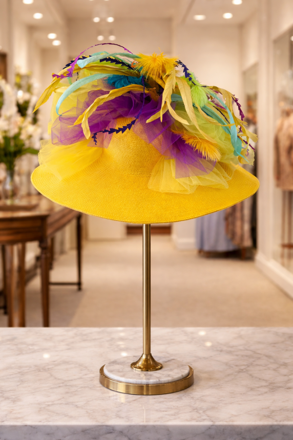 - The base is a bright golden-yellow woven hat with a structured, sculpted shape.