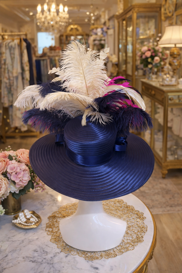 We are pleased to introduce the 'Fushia Empress', a new arrival on our website, featuring a stunning hat in rich navy, off-white, and fushia hues that is sure to impress!