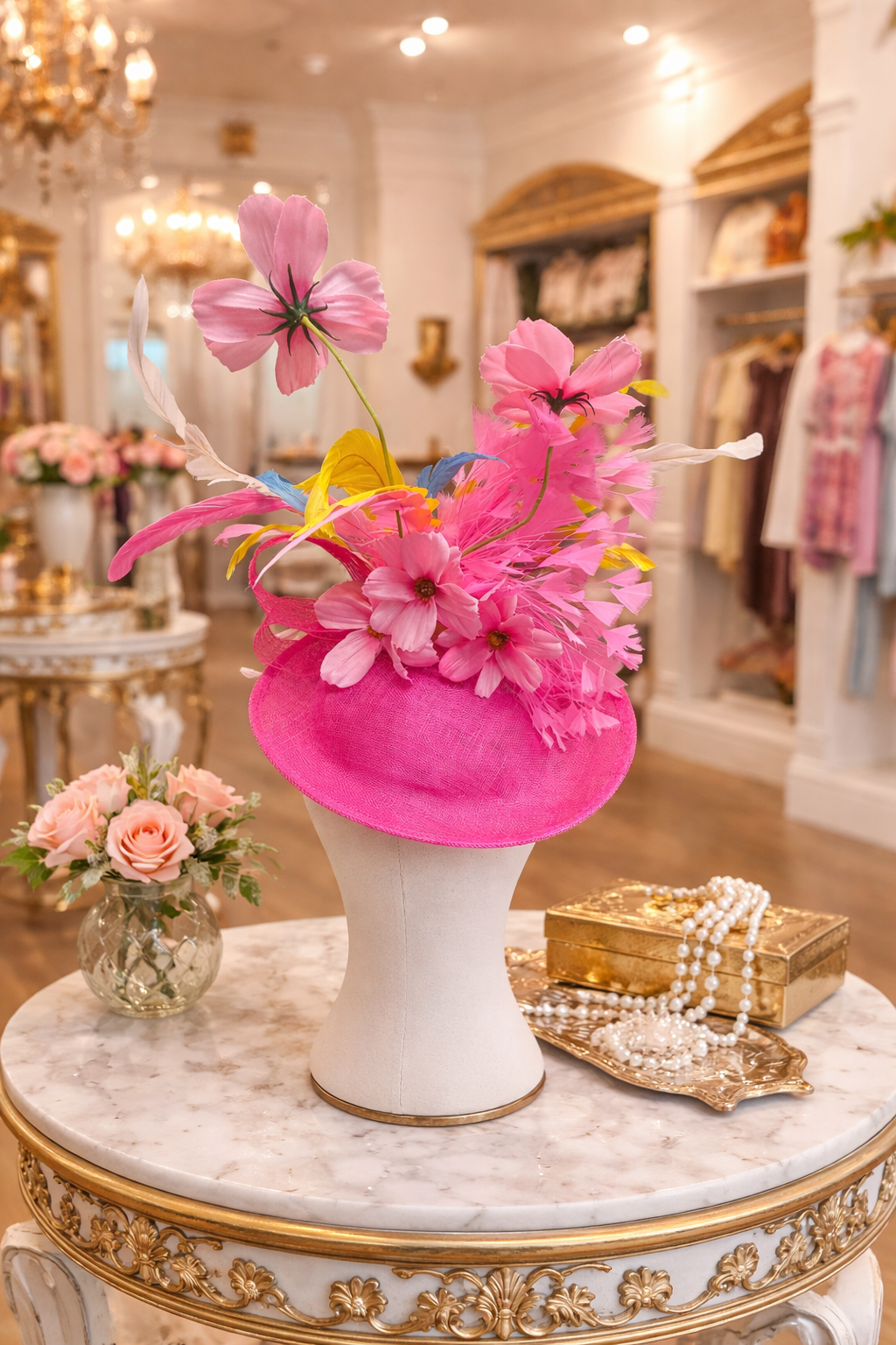 Harper’s Derby Run is a vibrant celebration of springtime elegance and Derby-day charm. Designed to turn heads from the paddock to the First Turn, this statement fascinator features a striking arrangement of soft pink blooms, airy feathers in sunlit yellow, sky blue, and blush, and a beautifully structured base that frames the face with effortless grace.